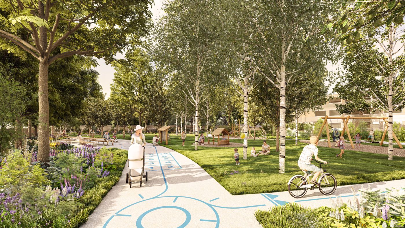 Perspective phase projet – Vue depuis l’entrée du Square des Familles © UAPS – BASE – TPFI – FBC